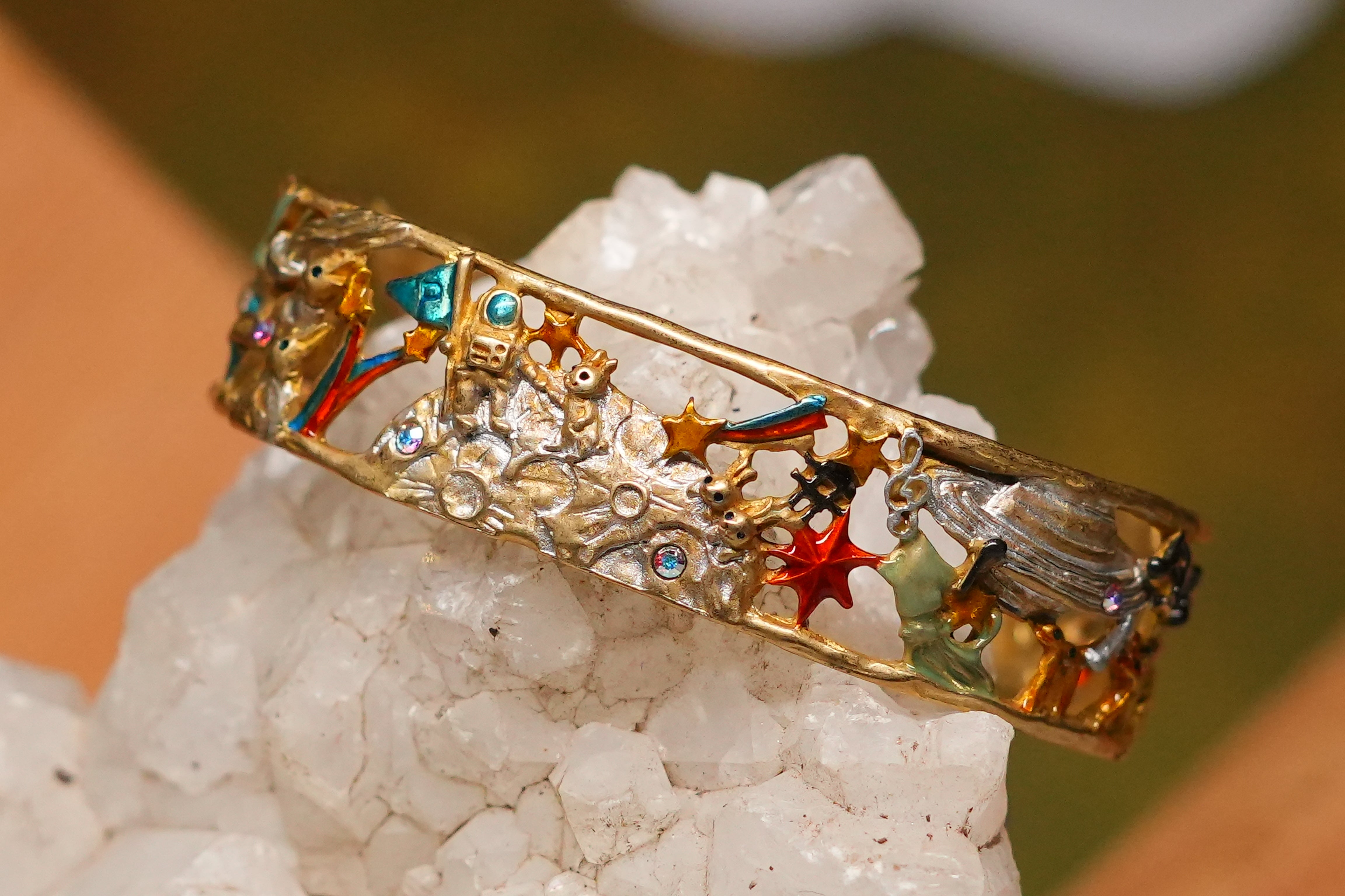 This intricately designed bangle expresses the beauty of our world and beyond with familiar motifs of the moon, and stars an astronaut, Saturn, dolphins and penguins.