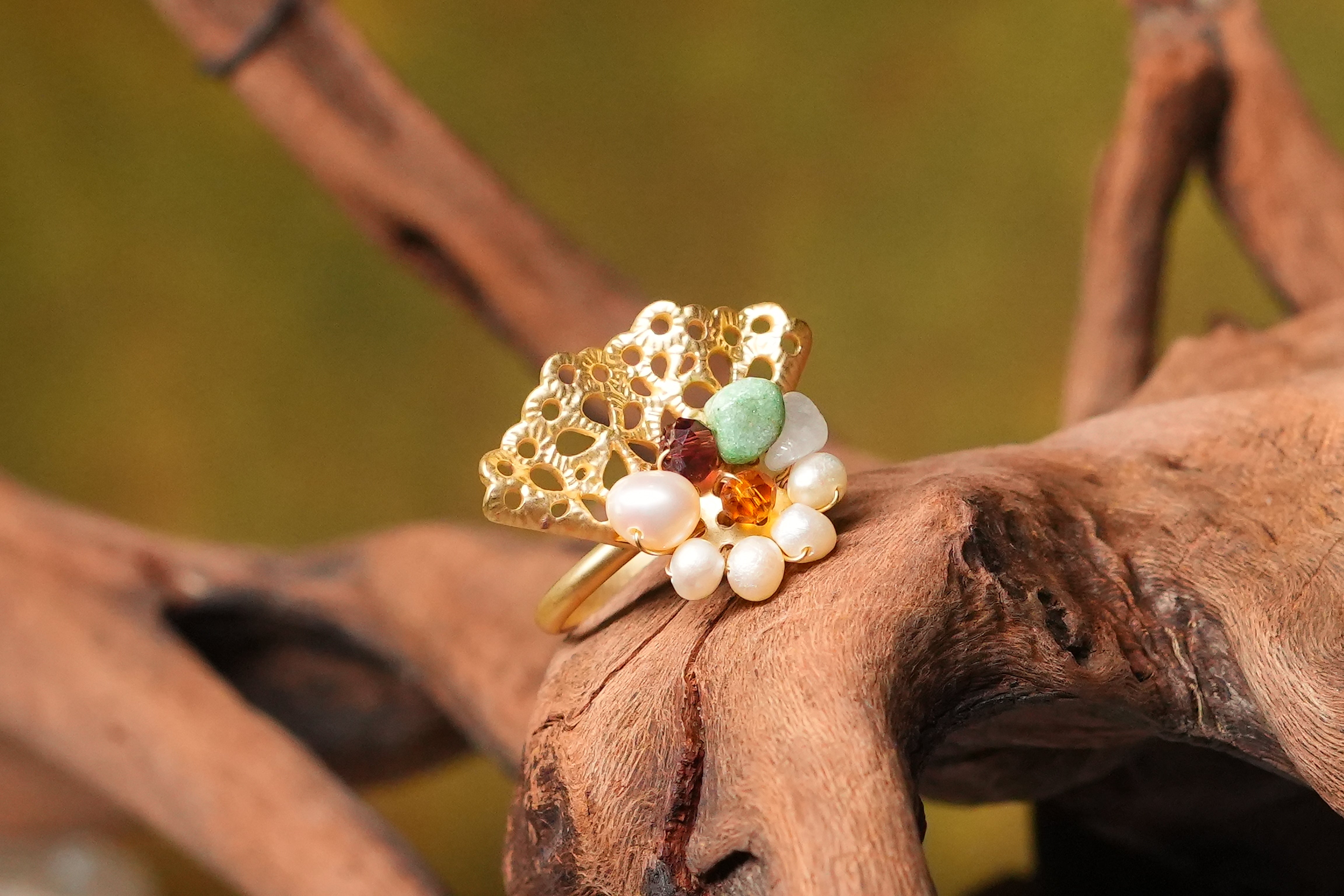 The Perline Ring and Earrings are delicately placed with a hint of natural stones which has been formed from the light movement of chemical lace.
