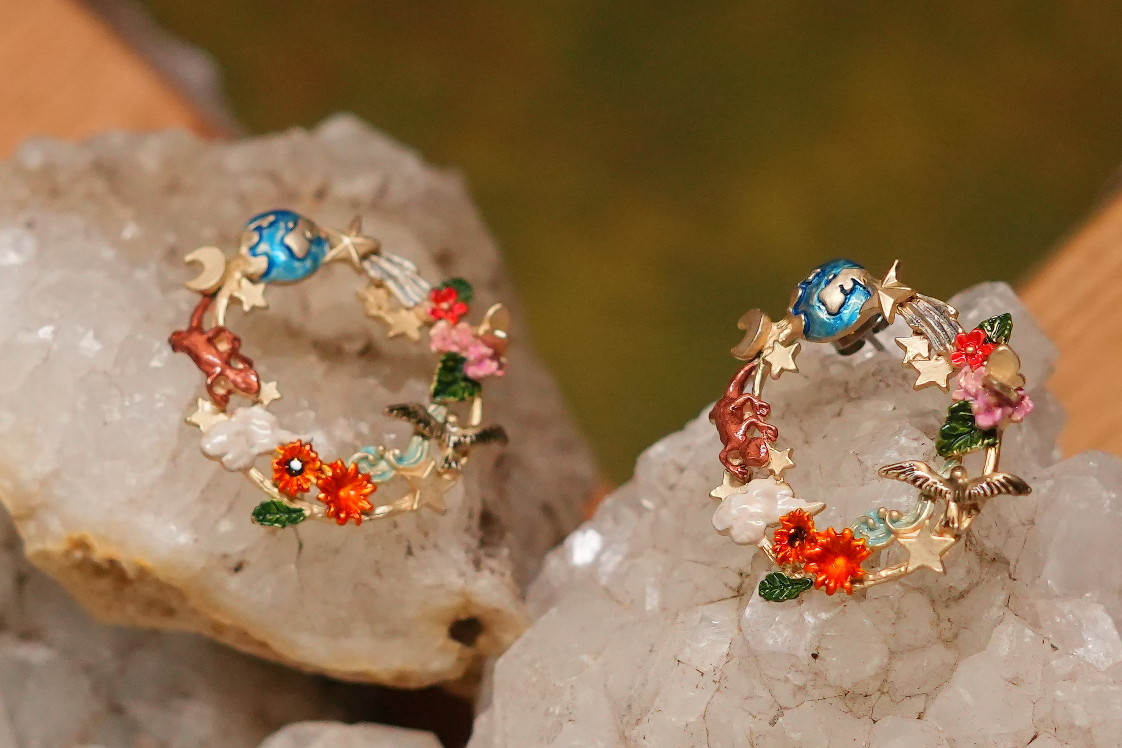 The world that indicates the 4 seasons, starting from planet. winter, spring, summer and autumn. The shooting stars depicts the winter skies, with the butterflies snuggling up to the flowers in summer, the migratory birds crossing the ocean in summer and the beautiful cosmos dyed at dusk in autumn. These earrings have been designed with great attention to detail, such as the three-dimensional appearance of the butterflies and the veins of the leaves.