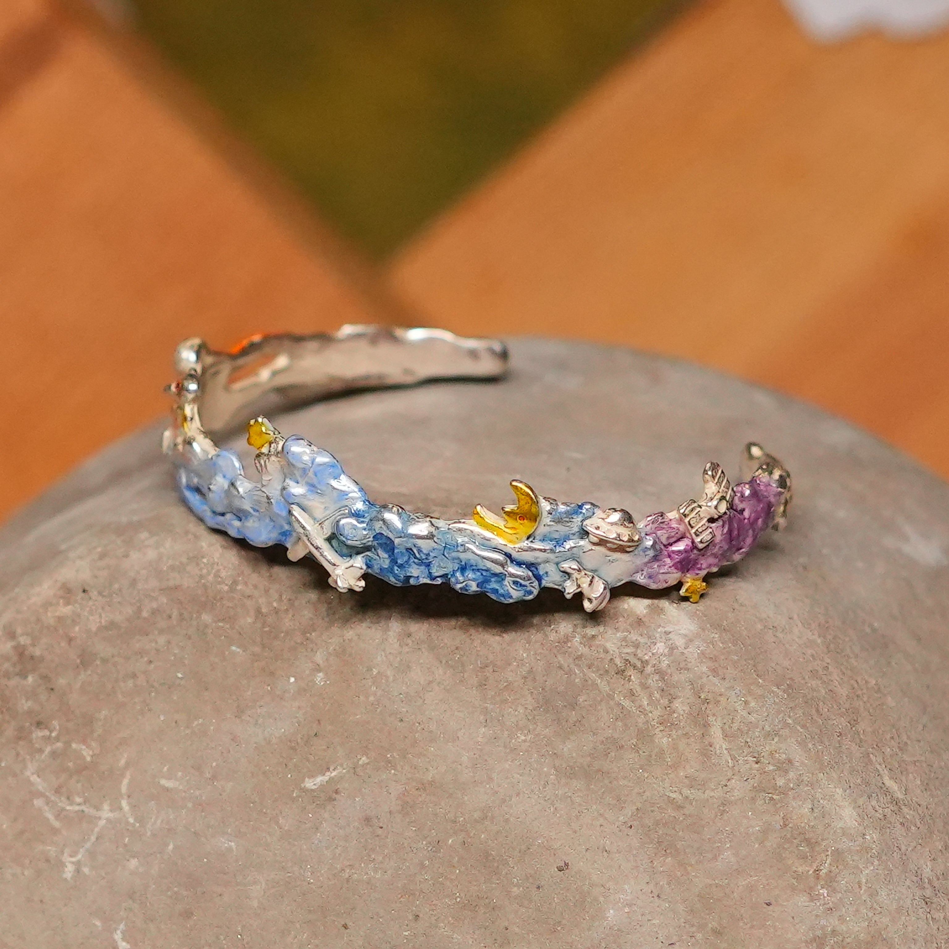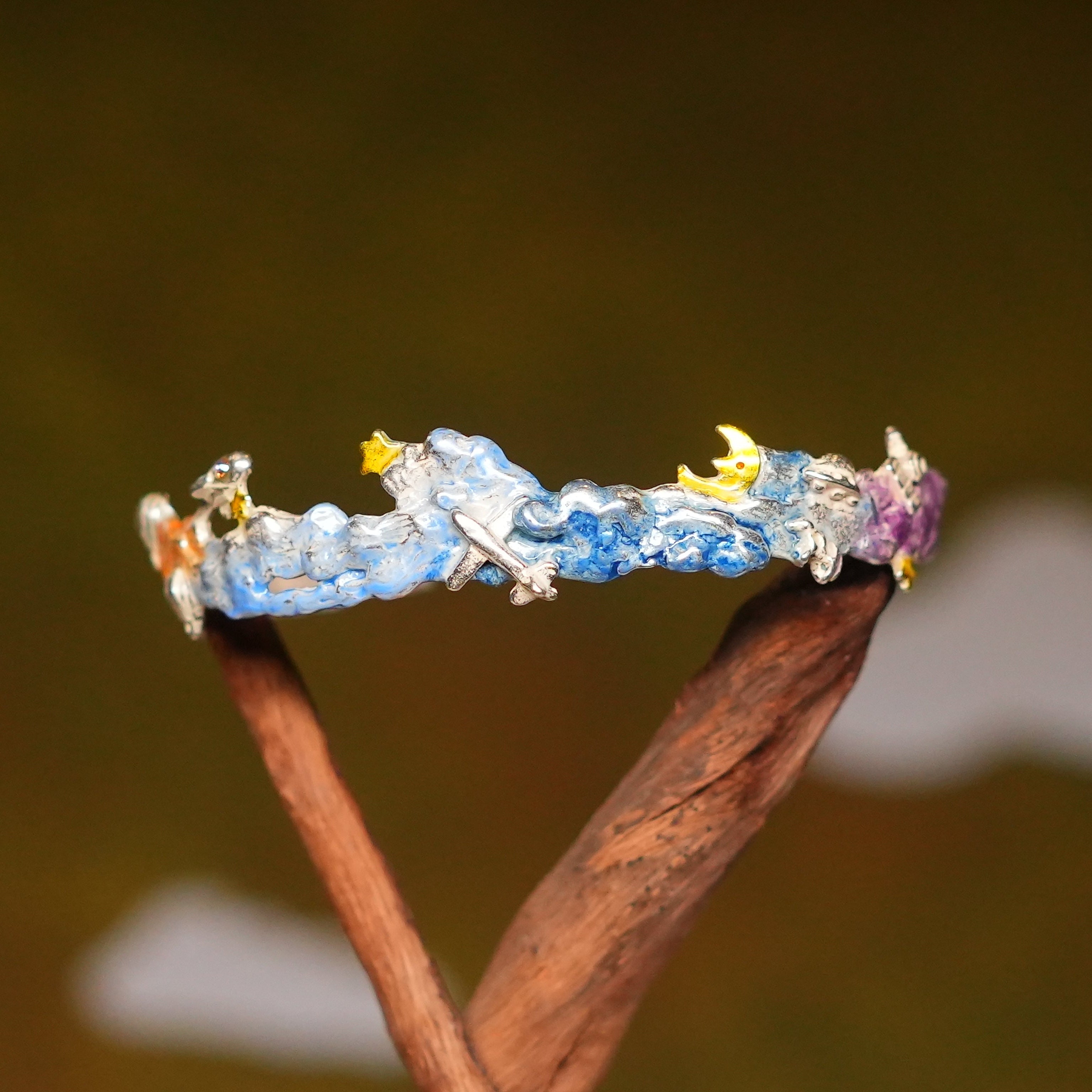 This intricate piece with light blue and purple gradation is studded with balloons, rockets, airplanes, UFO's and artificial satellites!Product Type:- BangleMaterial:- BrassSize:- 12.5 cm Around The Arm