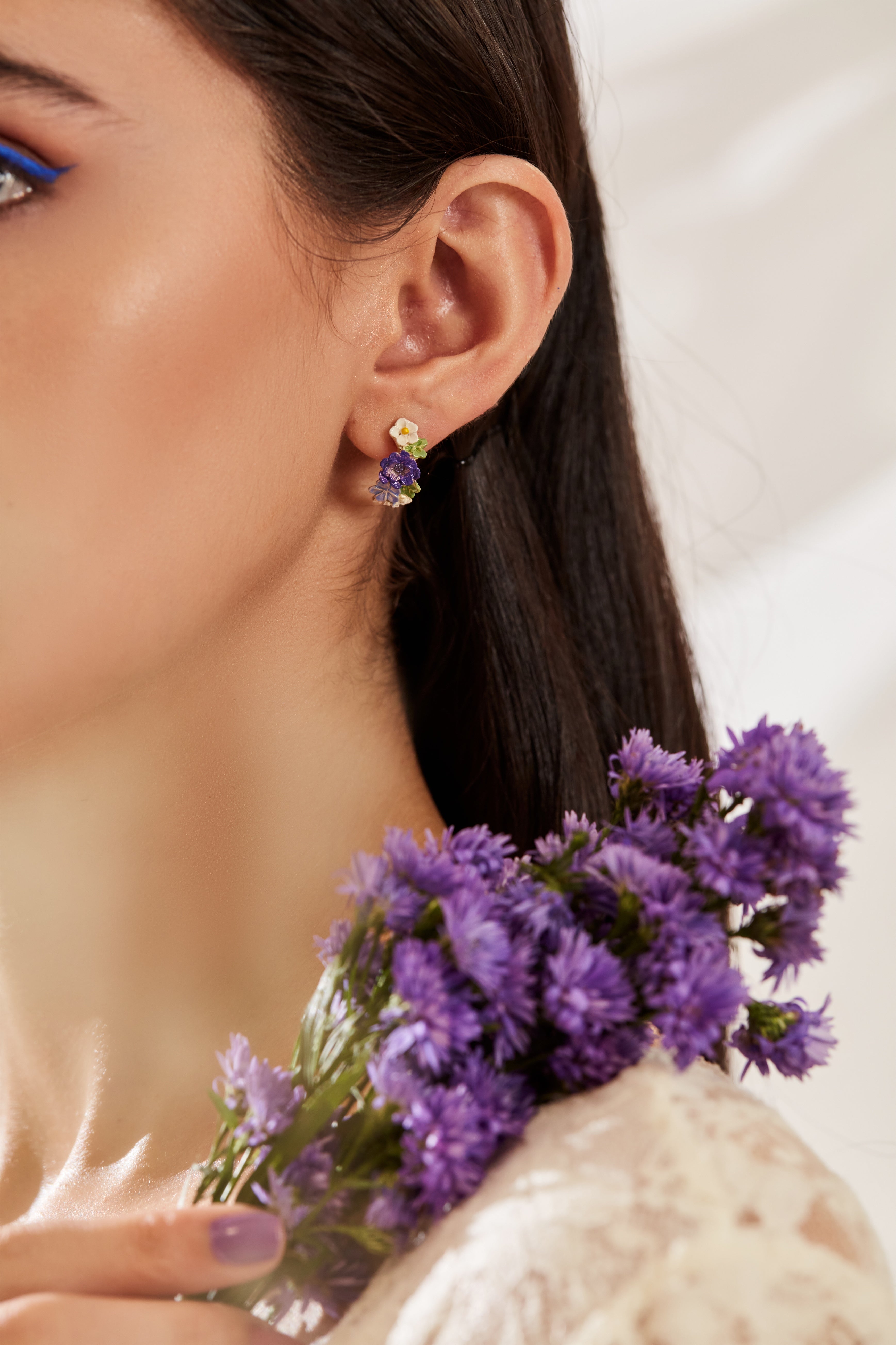 These alluring flower bouquet earrings are a reminder of springtime. It comprises 5 flowers and each of them has a flower language, starting from the top Strawberry flower means 'respect and affection" Clover means a "happy family and being lucky' Anemone stands for "believing in yourself" Pansy means 'being thoughtful'...